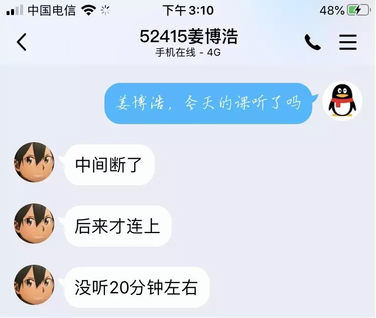 現(xiàn)在采取的處理方式是多樣性的選擇,做多個(gè)預(yù)案。比如,選擇多個(gè)直播平臺(tái)和軟件進(jìn)行嘗試。我使用了例如QQ課堂直播手段作為學(xué)習(xí)通的備用方案,一旦出現(xiàn)問題,及時(shí)啟動(dòng)解決。從現(xiàn)在的實(shí)踐情況來(lái)看,取得了不錯(cuò)的效果,同學(xué)反饋很好。