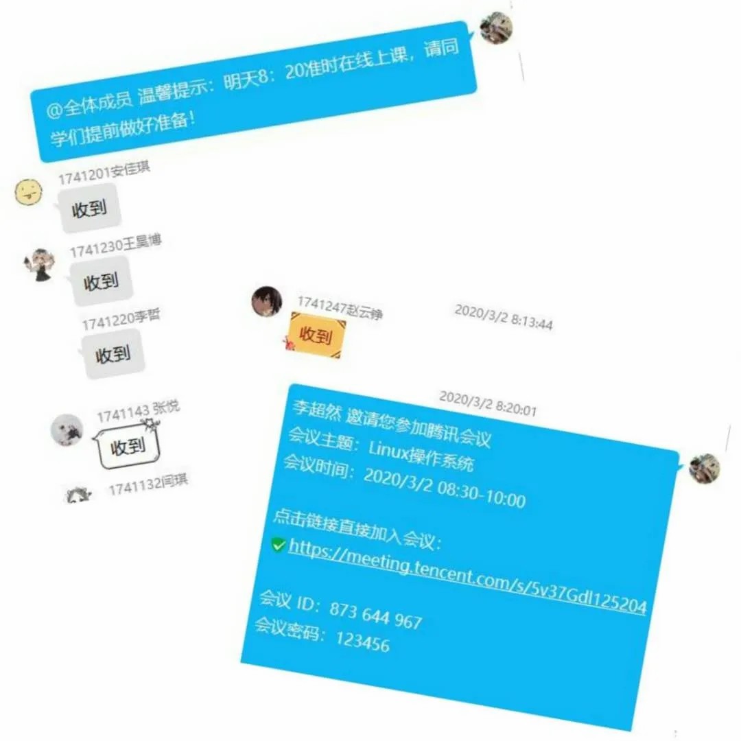 1) 例如上午第一節(jié)課是8:30分正式上課,每次都會(huì)在前一天晚上和第二天早晨多次提醒同學(xué)們準(zhǔn)時(shí)上課,提前十分鐘開(kāi)啟會(huì)議模式確保每位學(xué)生在線(xiàn)聽(tīng)課。