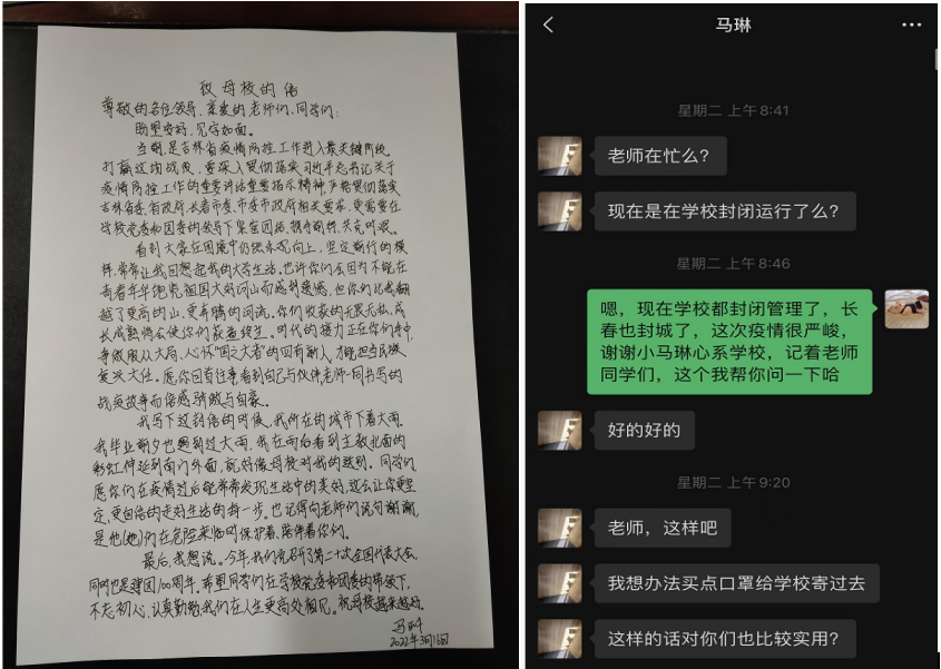 陳老師表示:抗擊疫情,人人有責,由于吉林省疫情防控部署安排,自己雖然不能在現(xiàn)場與老師同學們一起開展疫情防控工作,但會盡己所能,用實際行動助力抗“疫”,希望通過捐贈防疫物資為校園疫情防控工作貢獻自己的力量,擔負起應(yīng)有的責任。
